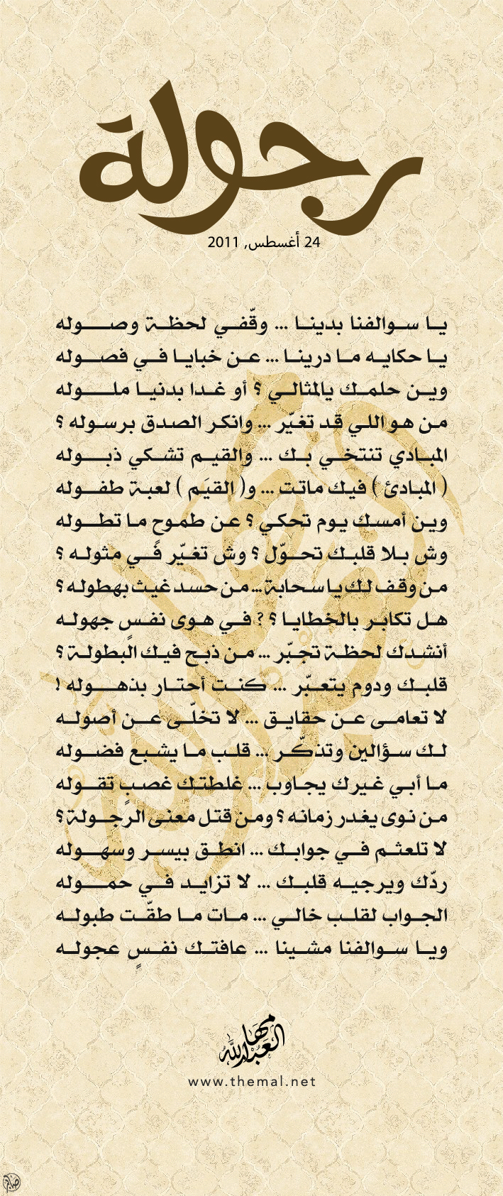 كنت ولا زلت ضد التعميم والتخصيص بخطابي مُتعمّد ومقصود ! ومثلك وشرواك بعيد كل البُعد عن مرسى ( رجولة ) ويكفي ثمال منك عتاباً سيقى خالداً بالذاكرة